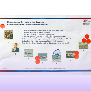 Ein zentrales Element des Netzwerktreffens war das eigens entwickelte interaktive Spiel „Flugreise“. In sieben symbolischen Etappen – vom Check-in über den Steigflug bis zur Ankunft – reflektierten die Teilnehmenden ihre aktuelle Transformationsreise. Das Format regte nicht nur zum Nachdenken an, sondern förderte auch Kreativität, gegenseitiges Verständnis und den gemeinsamen Austausch.